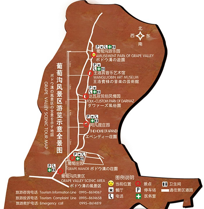吐魯番市的葡萄溝位于吐魯番市東北15公里處的葡萄鎮(zhèn),距城市中心10公里,海拔300米。葡萄溝系火焰山西側(cè)的一個(gè)峽谷,南北長8公里,東西寬0.6-2.0公里,溝谷狹長平緩。溝谷西岸,懸崖對峙,崖壁陡峭,猶如屏蟑。溝內(nèi),溪流環(huán)繞,水質(zhì)純凈。