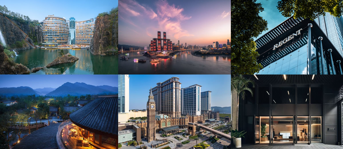 第一行從左至右:上海佘山世茂洲際酒店,重慶來福士洲際酒店,重慶麗晶酒店,