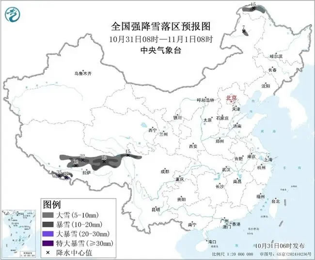 中央氣象臺10月31日6時繼續(xù)發(fā)布暴雪藍色預警:預計10月31日8時至11月1日8時,西藏中東部和西南部、川西高原北部、黑龍江西北部、內(nèi)蒙古東北部等地部分地區(qū)有大到暴雪,其中,西藏中部局地有大暴雪,西藏西南部局地有大暴雪或特大暴雪(30~35毫米)。上述部分地區(qū)新增積雪深度4~8厘米,山區(qū)局地可達15厘米以上。
