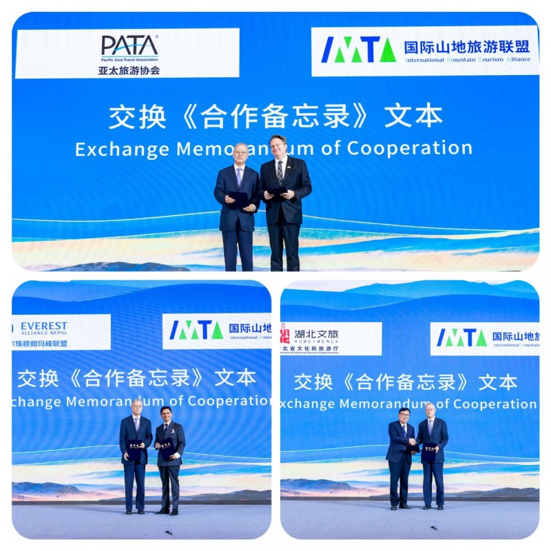 國際山地旅游聯(lián)盟副主席兼秘書長何亞非分別與亞太旅游協(xié)會主席彼得·西蒙(Peter Semone)、尼泊爾珠穆朗瑪峰聯(lián)盟主席蘇大山·尼泊爾(Sudarshan Nepal)、湖北省文化和旅游廳副廳長徐勇交換合作備忘錄,旨在通過資源共享、優(yōu)勢互鑒,為全球旅游業(yè)可持續(xù)增長注入新動能、貢獻實踐力量。