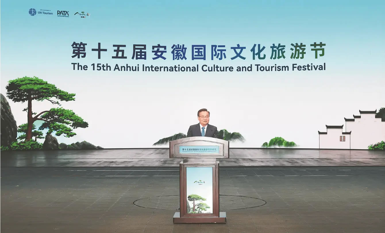 梁言順首先代表省委、省政府向各位嘉賓表示歡迎和感謝。他說,安徽山清水秀、歷史悠久,文化底蘊深厚,每一寸土地、每一片山水,都展現(xiàn)出迷人的風光、蘊藏著動人的故事,山水之韻同人文之勝相得益彰、交相輝映。近年來,我們?nèi)媛鋵?ldquo;發(fā)展全域旅游,把文化旅游業(yè)打造成為支柱產(chǎn)業(yè)”的重要指示,堅持以文塑旅、以旅彰文,持續(xù)做好“百業(yè)+文旅”“文旅+百業(yè)”大文章,“美好安徽 迎客天下”的金字招牌擦得更亮。當前,安徽正處在夯實基礎(chǔ)、全面發(fā)力、創(chuàng)先爭優(yōu)、跨越趕超的關(guān)鍵時期。我們將深入學習貫徹黨的二十屆四中全會精神,持續(xù)完善政策保障體系,推動文化和旅游業(yè)態(tài)融合、產(chǎn)品融合、市場融合,豐富高品質(zhì)文旅產(chǎn)品供給,打造更多文旅精品,讓海內(nèi)外游客在“詩和遠方”的雙向奔赴中續(xù)寫新的故事。