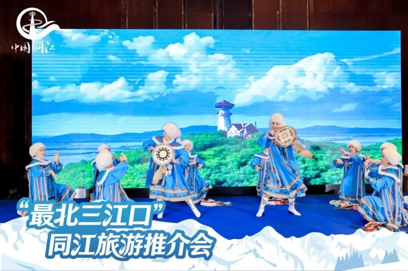 現(xiàn)場(chǎng)通過(guò)文創(chuàng)產(chǎn)品展示、宣傳片輪播、赫哲族舞蹈《赫尼那》迅速營(yíng)造出同江冰雪與民俗氛圍。