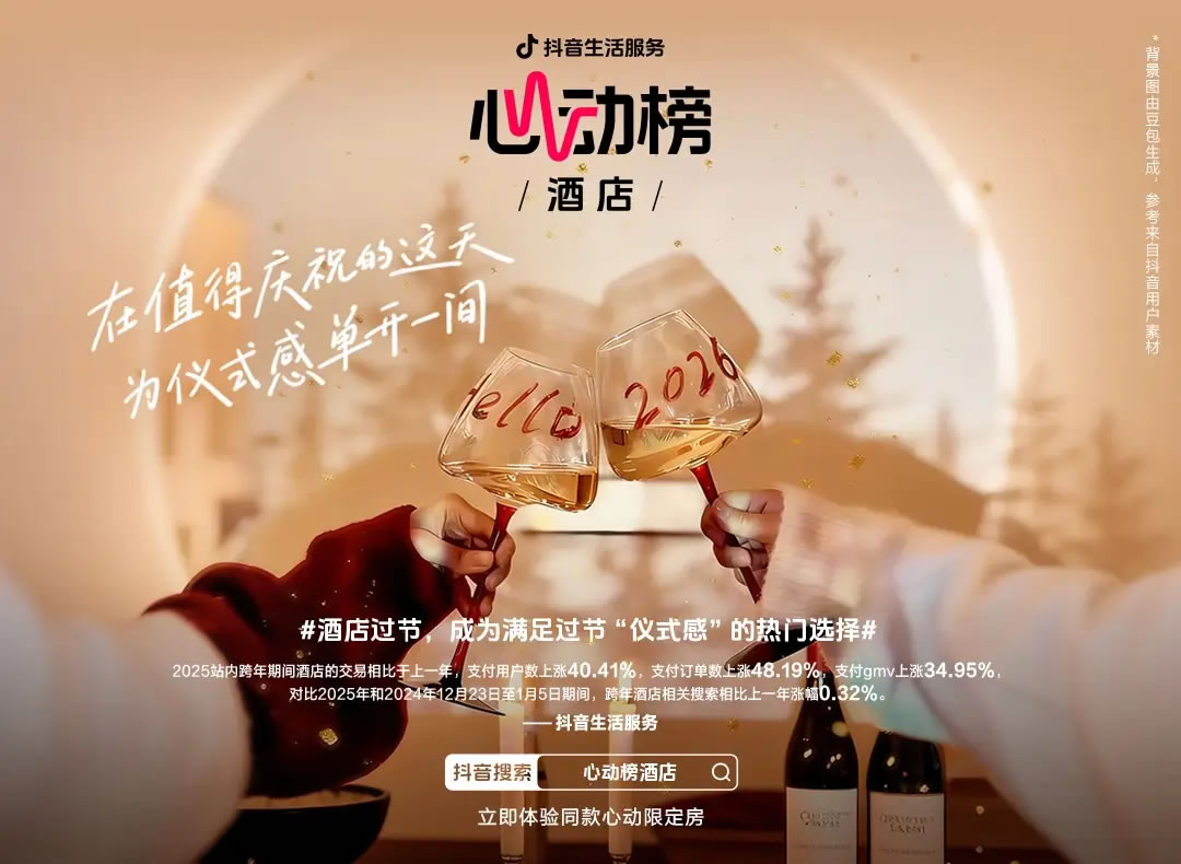 在這場(chǎng)全民性儀式感浪潮中,抖音生活服務(wù)推出的「心動(dòng)榜酒店」之跨年航班和紅人派對(duì),精準(zhǔn)切入并引爆了市場(chǎng)熱度,數(shù)據(jù)顯示,圍繞此類活動(dòng)的內(nèi)容播放量和參與度屢創(chuàng)新高。酒旅行業(yè)的競(jìng)爭(zhēng)邏輯,正在從傳統(tǒng)的“目的地與價(jià)格”之爭(zhēng),全面升級(jí)為 “場(chǎng)景營(yíng)造與情緒共鳴”, 抖音正試圖重塑高端酒店的消費(fèi)體驗(yàn),并重新定義節(jié)假旅行的消費(fèi)決策路徑。