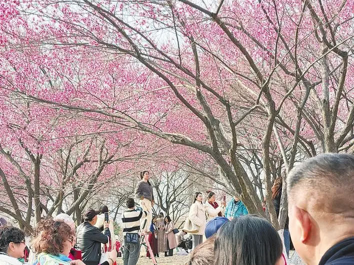 雖是工作日午后,坡上已有數(shù)百位市民游客漫步賞玩;ㄓ叭顺敝校藢(zhuān)程而來(lái)的攝影愛(ài)好者架起“長(zhǎng)槍短炮”,更有許多家庭扶老攜幼,在梅林間游玩、野餐。曾是約拍行業(yè)淡季的隆冬時(shí)節(jié),也成了旺季。“花期比往年早了近一個(gè)月,好幾個(gè)周末的‘約拍’都排滿(mǎn)了。”攝影愛(ài)好者周女士邊調(diào)整鏡頭邊說(shuō)。據(jù)攝影師“四葉草”介紹,周末這里人流如織,即便今天是工作日,前來(lái)拍照的游客依然不少。“目前‘梅花坡’花開(kāi)得最盛,大家都搶著來(lái)出片,競(jìng)爭(zhēng)壓力不小。眼下的梅花是開(kāi)年第一波熱度。”
