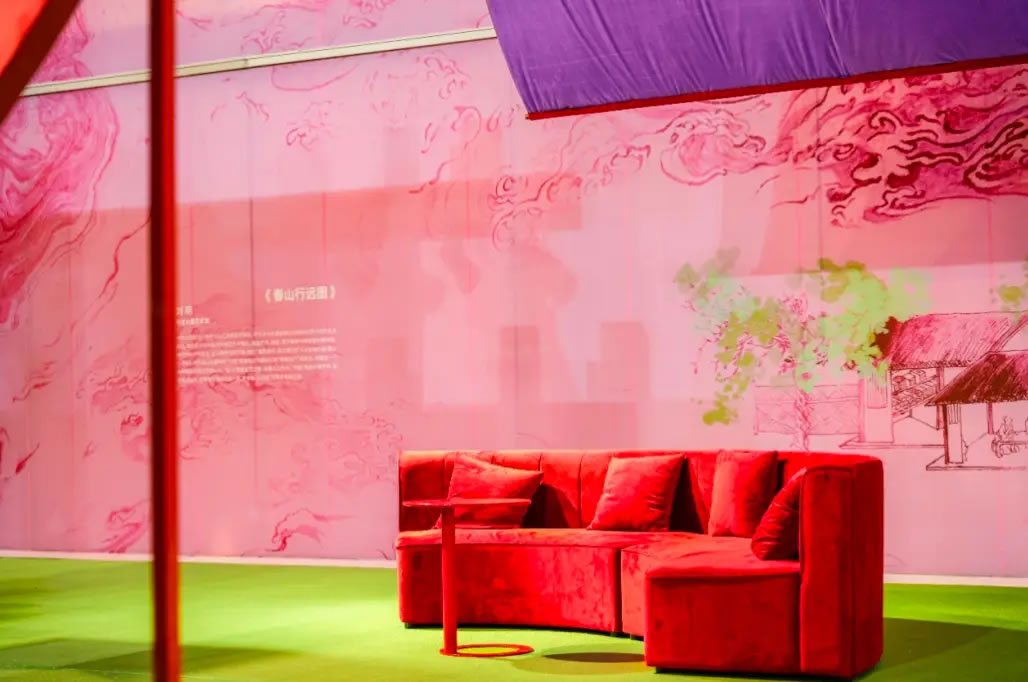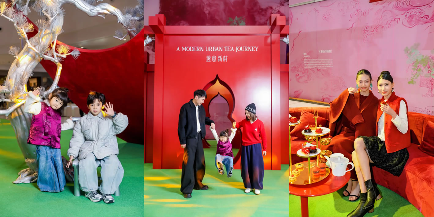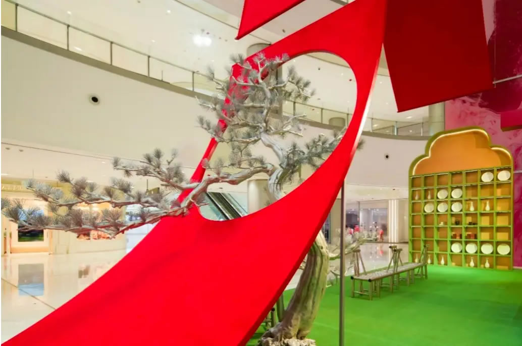 山水,并非遠(yuǎn)行才可得見。書法水墨藝術(shù)家劉玥首展作品《春山行遠(yuǎn)圖》以20米巨幅“山水開卷”,步入其中,與天地春意從容照面;紅色的帷幔落于銀色的松枝上,就像于山間松下靜謐的一隅,“幕下棲心”將是絕佳開年時(shí)尚大片的打卡處;松下銀椅,為你與摯友“漫敘往來”的相聚時(shí)刻營(yíng)造出寧?kù)o、松弛的氛圍;多寶閣中陳列著未經(jīng)雕琢的茶器素胚與場(chǎng)內(nèi)品牌萬(wàn)仟堂,長(zhǎng)沙尼依格羅酒店及tea'stone帶來的新春茶器,以“初芒蘊(yùn)能”詮釋著未來的無(wú)限可能與新生力量。轉(zhuǎn)身與“蒔光種愿” 四方亭相遇。葫蘆門朝四方而開,寓意著納四方福祿,步入其中,與數(shù)字交互藝術(shù)家吳旭首展作品《無(wú)限福祿》體驗(yàn)互動(dòng),跟隨指引揮動(dòng)手勢(shì),觸發(fā)粒子凝聚為動(dòng)態(tài)“福”字,親手完成一場(chǎng)新春祈福儀式。我們把象征團(tuán)圓與喜悅的紅色沙發(fā)打造“盞間聚暖”,如懷抱般圍合的布局作為“歸處”的隱喻。與家人團(tuán)聚便是心歸處,這將是中國(guó)年最圓滿的意象。