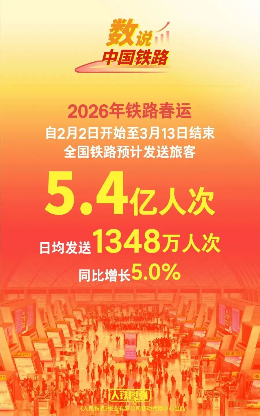 2026年鐵路春運今日啟動,自2月2日至3月13日結(jié)束,為期40天,全國鐵路預(yù)計發(fā)送旅客5.4億人次,日均發(fā)送1348萬人次、同比增長5.0%。