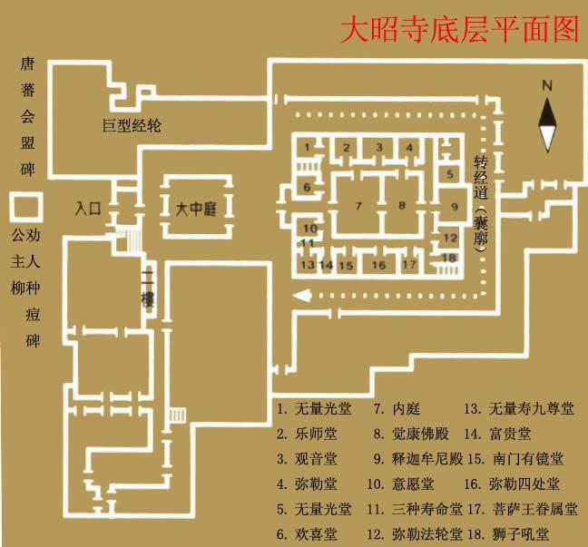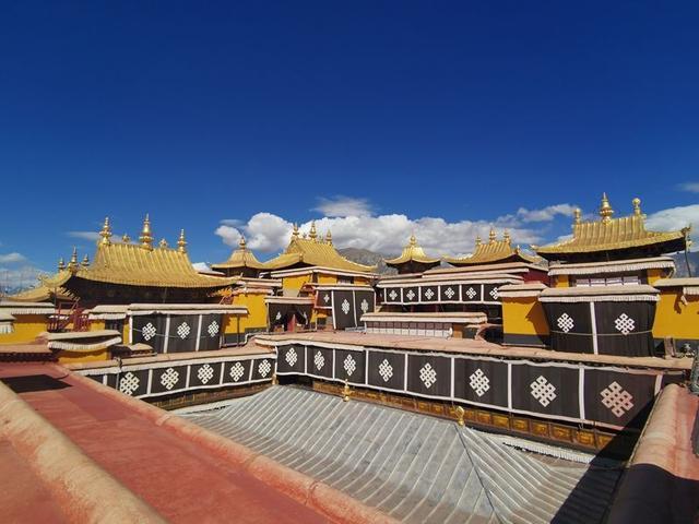 從大昭寺金頂可以看到大昭寺廣場,右邊遠處山上是布達拉宮,近處的柳樹是“公主柳”,相傳是文成公主所栽。大昭寺的布局方位與漢地佛教的寺院不同,其主殿是坐東面西的。主殿高四層,兩側列有配殿,布局結構上再現了佛教中曼陀羅壇城的宇宙理想模式。寺院內的佛殿主要有釋迦牟尼殿、宗喀巴大師殿、松贊干布殿、班旦拉姆殿(格魯派的護法神)、神羊熱姆杰姆殿、藏王殿等等。寺內擁有各種木雕、壁畫。
