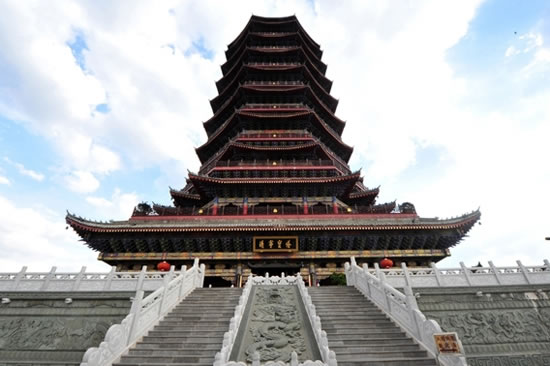 靖寧寶塔位于寥廓山頂,屬曲靖城市最高點的地標性建筑。靖寧寶塔占地9997平方米(13畝)、總投資7000萬元,分為主塔建設(shè)和室外環(huán)境配套建設(shè)兩部分。主題建筑面積7427平方米,建筑立面為明清仿古式樓閣造型,主塔為9層,底層為四邊形,二層以上呈八邊形布置,每層收分60厘米,塔總高81.6米,塔主題由塔基、塔身、塔剎三部分組成。