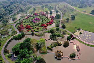 百花園為中國(guó)科學(xué)院西雙版納熱帶植物園的第一景,占地面積353畝,現(xiàn)收集保存與展示熱帶花卉植物645種(品種)。百花園植物布景主要采用孤植、純林大片種植、同類多品種集中收集、?茖俦4妗⑴示壖八ɑ苤参锒喾N方式展示。并力求與地形水域巧妙結(jié)合,形成不同的賞景空間,創(chuàng)造“天女散花”、“層林盡染”、“五彩繽紛”和“花開花落”等景觀效果。借助區(qū)內(nèi)大量花卉植物,通過(guò)挖掘花卉與人們?nèi)粘I、信仰和情感的關(guān)聯(lián),以及古往今來(lái)的文人墨客以花卉植物創(chuàng)作出的傳說(shuō)故事、詩(shī)歌等文學(xué)作品,以對(duì)聯(lián)、字畫、牌匾等形式展示于園區(qū)內(nèi),充分展示花卉植物的科學(xué)和文化內(nèi)涵。