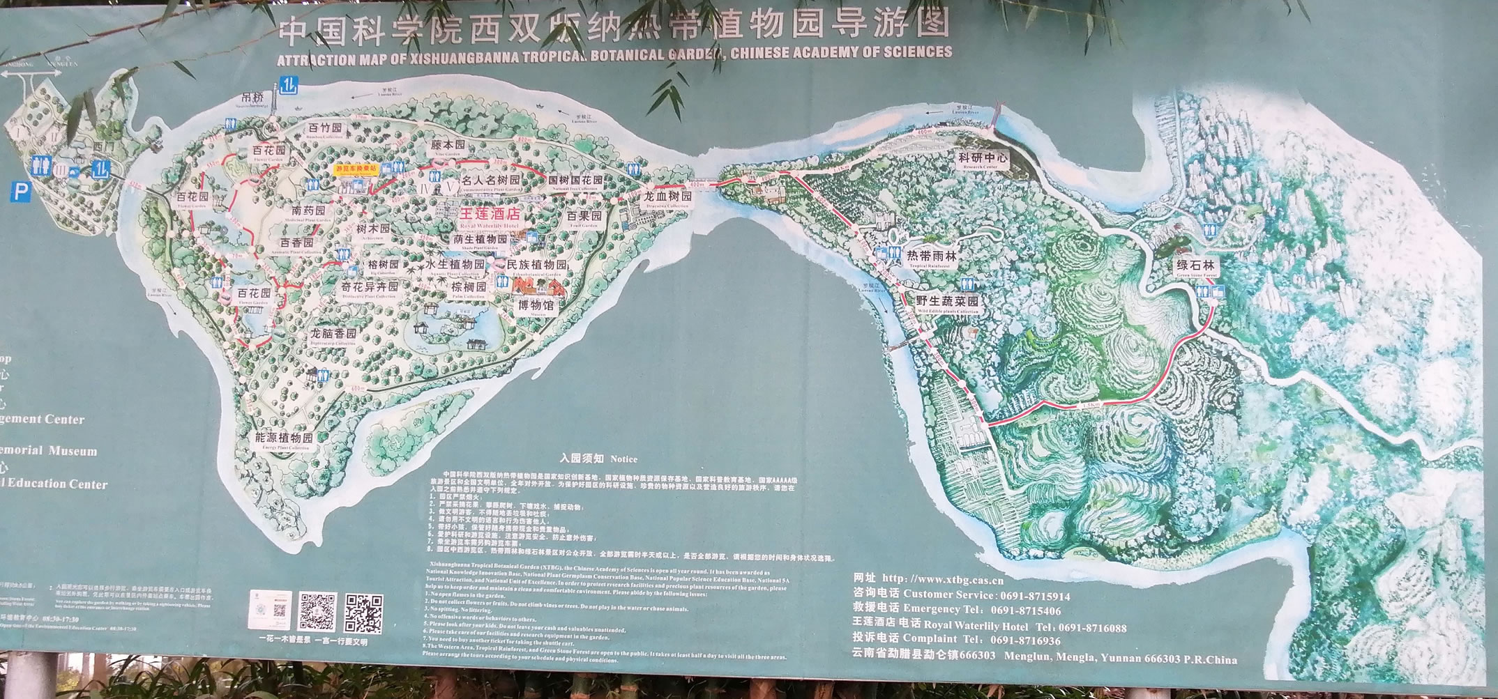 截至2015年9月,在占地面積約為11.25km2中國(guó)科學(xué)院西雙版納熱帶植物園里,收集有活植物12000多種,建有38個(gè)植物專類區(qū),還保存有一片面積約250hm2的原始熱帶雨林。