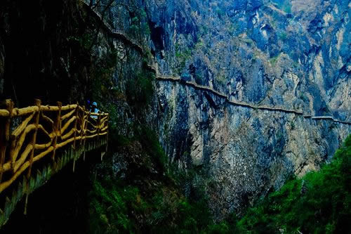 ②高空棧道探險游路:福緣橋——龍王廟——天開石門——鶴峰亭——五道水服務區(qū)——高空玻璃棧道——七彩玻璃觀景平臺——高空棧道——七道水彩虹橋——七道水瀑布——野生芭蕉林——百步天梯——萬獸谷——枯木要塞。全長3500米,