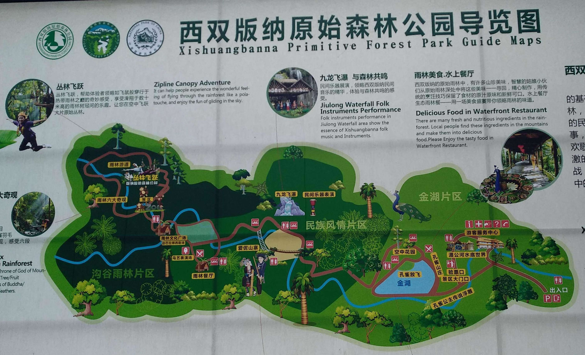 公園占地面積26310畝,園內(nèi)森林覆蓋率為98.6%,是目前北回歸線以南保存最完好的一片原始森林,它的自然優(yōu)勢(shì)融匯了原始森林神奇的自然風(fēng)光和濃郁的民俗風(fēng)情,集中突出體現(xiàn)了"熱帶溝谷雨林"、"以孔雀文化為主的野生動(dòng)物展示"、"以哈尼族-愛尼人為主的民俗風(fēng)情展示"三大主題特色,同時(shí)配備有按四星級(jí)打造集客房、餐飲、會(huì)務(wù)、娛樂為一體的孔雀山莊度假村。"勐巴拉納西"是一個(gè)充滿美好、理想和神奇的地方,旖旎的自然風(fēng)光、翡翠般的森林、絢麗多姿的民族風(fēng)情,膠園、茶園、瀾滄江。