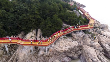 松蘭山游步道位于松蘭山沿海岸線,南起東沙灘,北至白沙灣,以棧道形式沿濱海礁石海灘穿行,全長3.1公里,平均寬度為2.5米,總面積約12萬平方米。棧道是集公眾性、休閑性、生態(tài)性為一體的高品質(zhì)濱海慢行步道,沿線設(shè)置濱海眺臺、觀景平臺等,全程以紅色為主調(diào),素有“海上紅絲帶”之美譽。