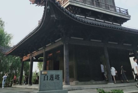 白蓮塔位于西柵大運河畔的環(huán)河島上,白蓮塔高有七級,塔高約51米,為烏鎮(zhèn)最高建筑,塔下有八角形的升蓮廣場,廣場中有放生池,東側(cè)河岸邊有一條石舫。白蓮塔屬于宋元時期江浙一帶通行的磚木混合結(jié)構(gòu)的閣式塔,縱觀其塔,外觀呈梭狀,實際上塔的平面是呈正方形的,塔基也是一個24米乘24米的正方形,內(nèi)部地面用清水方磚鋪就而成。